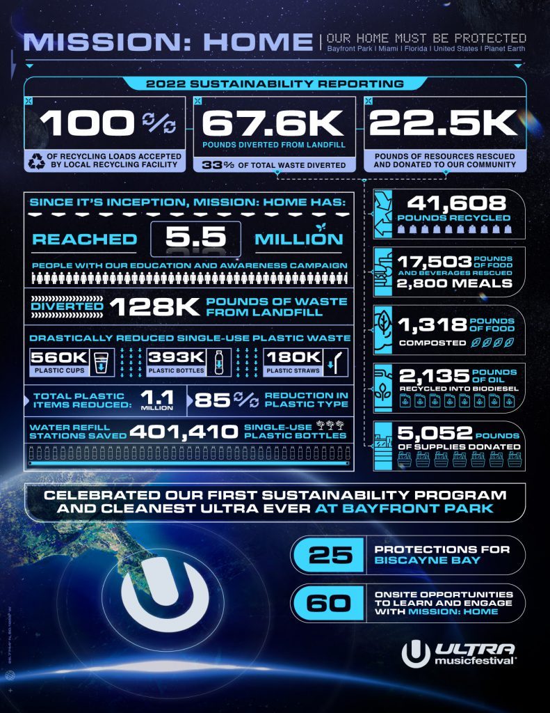 Este año en Ultra Miami, Mission: Home implementó con éxito 30 iniciativas de sostenibilidad, lo que lo convierte en el programa de sostenibilidad más amplio de los principales festivales de música dance de Estados Unidos. Llevaron la gestión de desechos a un nivel completamente nuevo al donar más de 22,500 libras de alimentos, bebidas y suministros sin usar a socios de la comunidad local.