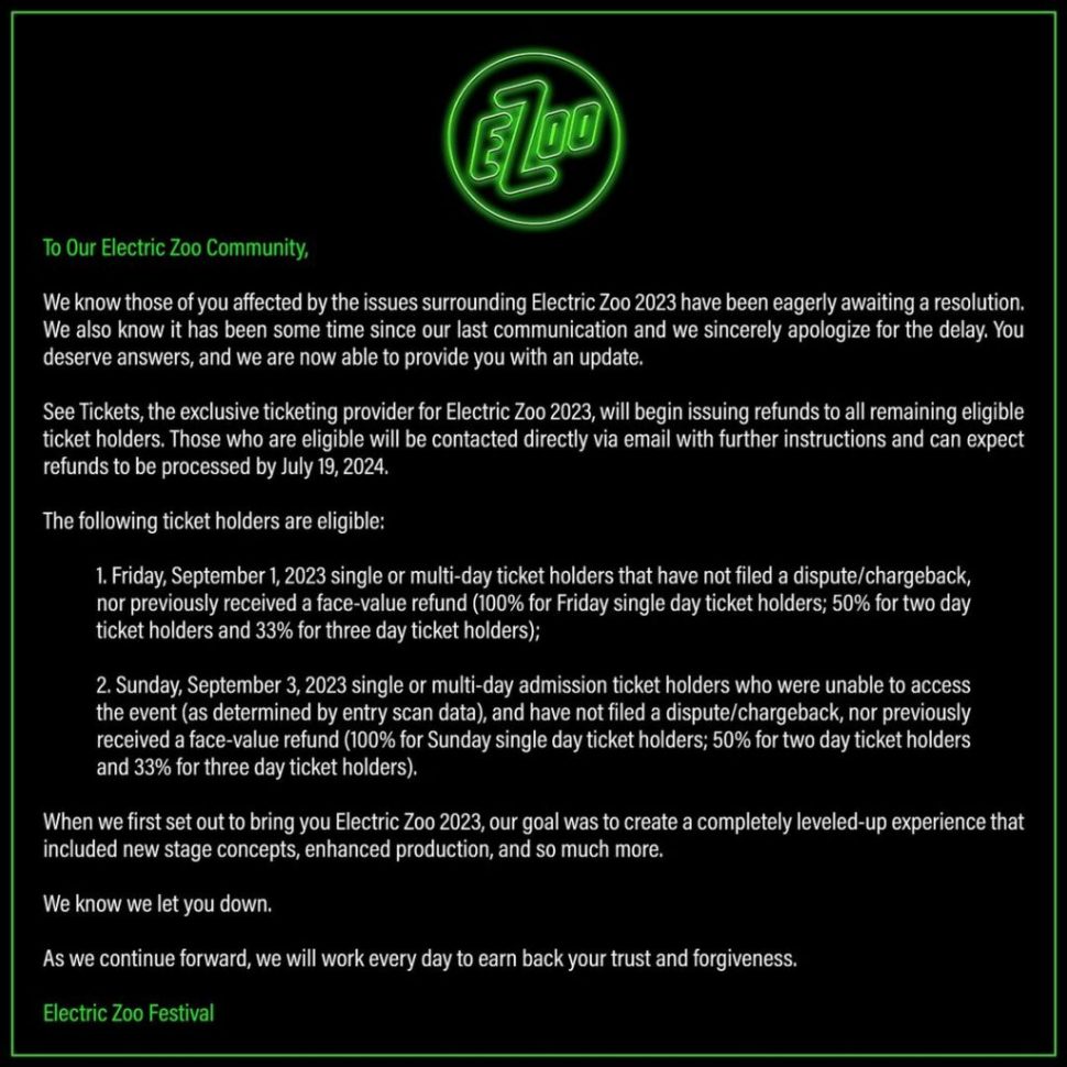 Ahora, Electric Zoo ha anunciado a través de See Tickets que los reembolsos se realizarán a todos los poseedores de boletos que aún sean elegibles, y se espera que el proceso finalice el 19 de julio. Este anuncio llega después de una intensa presión por parte de la comunidad y de campañas en redes sociales que exigían transparencia y responsabilidad.