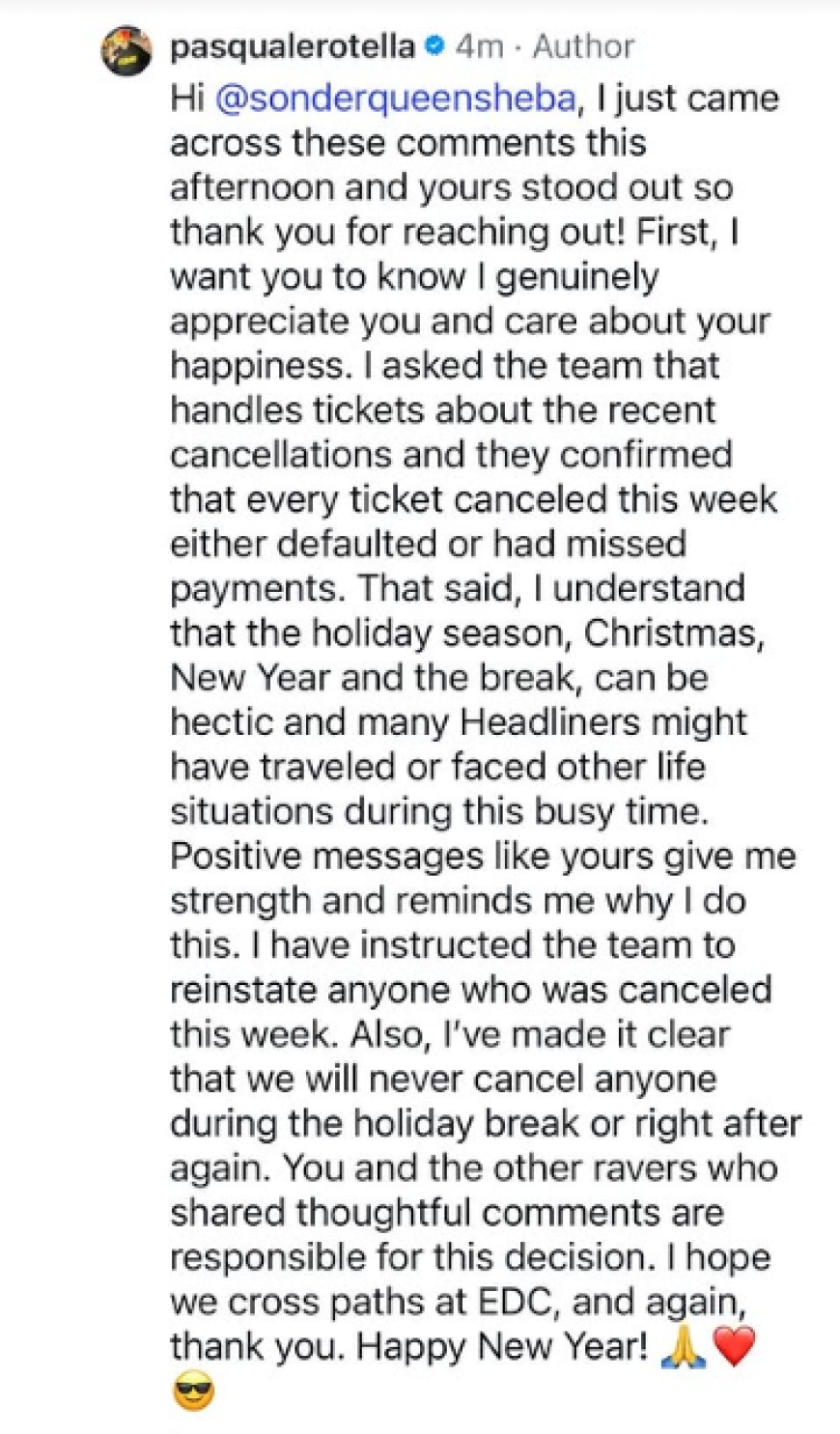 Luego de varios días de incertidumbre y reclamos en redes sociales, el fundador y CEO de Insomniac Events, Pasquale Rotella, salió personalmente a explicar qué ocurrió con una serie de entradas canceladas para EDC Las Vegas, tranquilizando a los asistentes y asegurando que nadie perderá su acceso de forma definitiva por un pago atrasado en modalidad layaway.