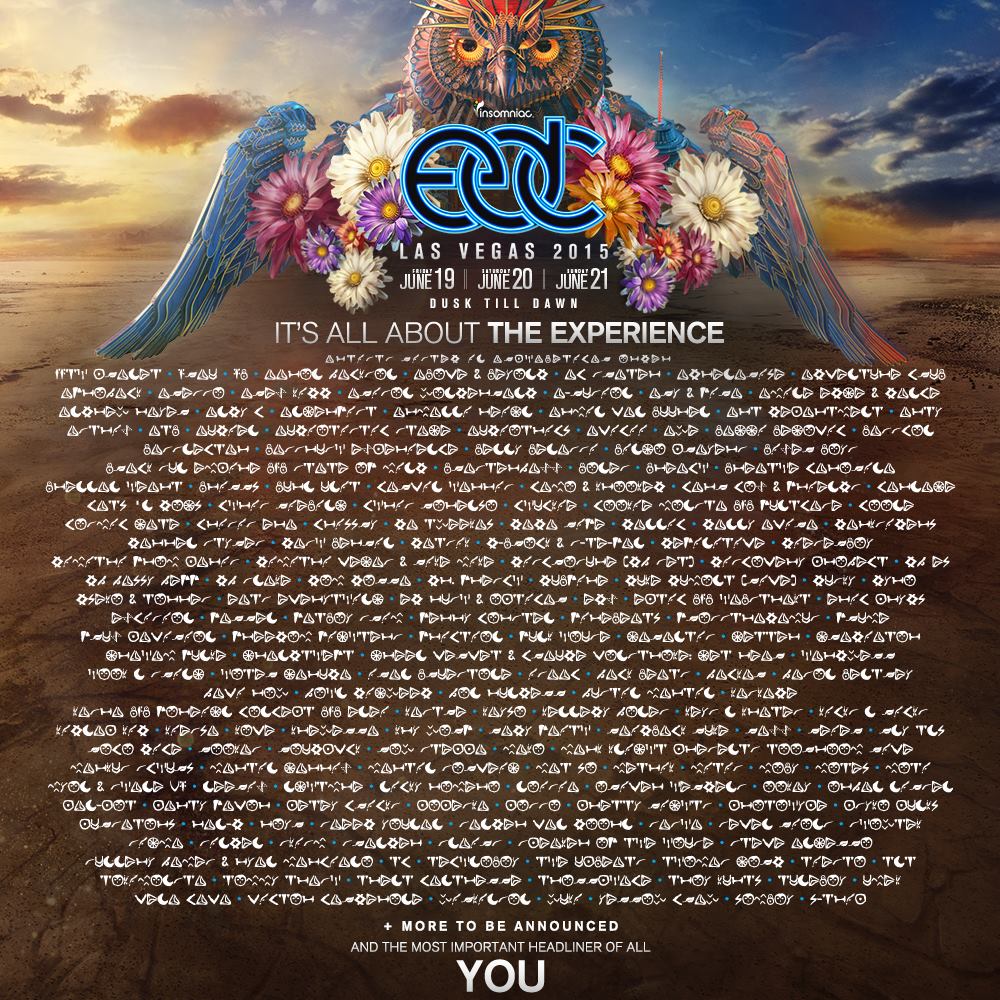 Los organizadores del festival que comienza más o menos en un mes, más exactamente del 19 al 21 de junio en Las Vegas se colocaron en la tarea de generar más expectativa al revelar de una manera muy particular el line-up oficial. Lo especial de la imagen publicada es el uso de un alfabeto propio, que ellos mismos llamaron el 'Owlphabet', en español algo así como 'el alfabeto del búho'; un abecedario hecho a medida con caracteres criptográficos y extrañas figuras que ocultan entre línea y línea los nombres de los artistas a presentar.