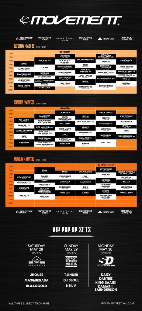 Una de las mejores características de Movement Detroit es que se permite el reingreso, por lo que puede ingresar y salir de Hart Plaza según sea necesario. Hart Plaza es un oasis bien contenido en la costa y Paxahau se asegura de llenar el parque con todo lo que necesitas. Otra característica fabulosa es que las fiestas posteriores son absolutamente asombrosas , y casi siempre se encuentran a poca distancia a pie del evento principal. Por último, a poca distancia de Movement Detroit hay un montón de historia, cultura, comida y entretenimiento para quienes lleguen antes o se queden después del festival. Si hay algo que aún necesita saber después de leerlo, consulte el sitio web de Movement Detroit para obtener más información.