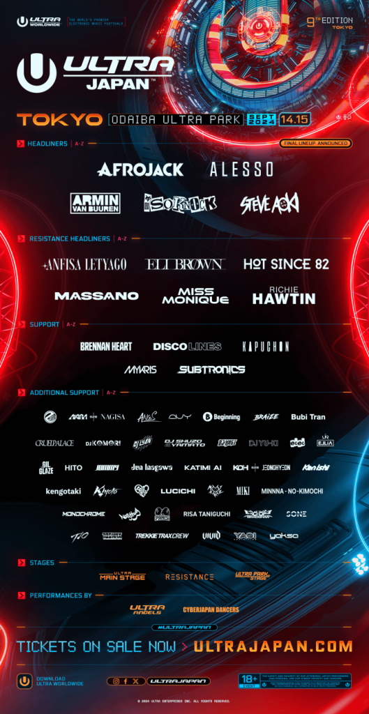 Además de las actuaciones en el escenario principal y el canal Resistance, la alineación oficial de Ultra Japón cuenta con una impresionante lista de artistas que abarcan varios géneros de la música electrónica. Entre los nombres destacados se encuentran: