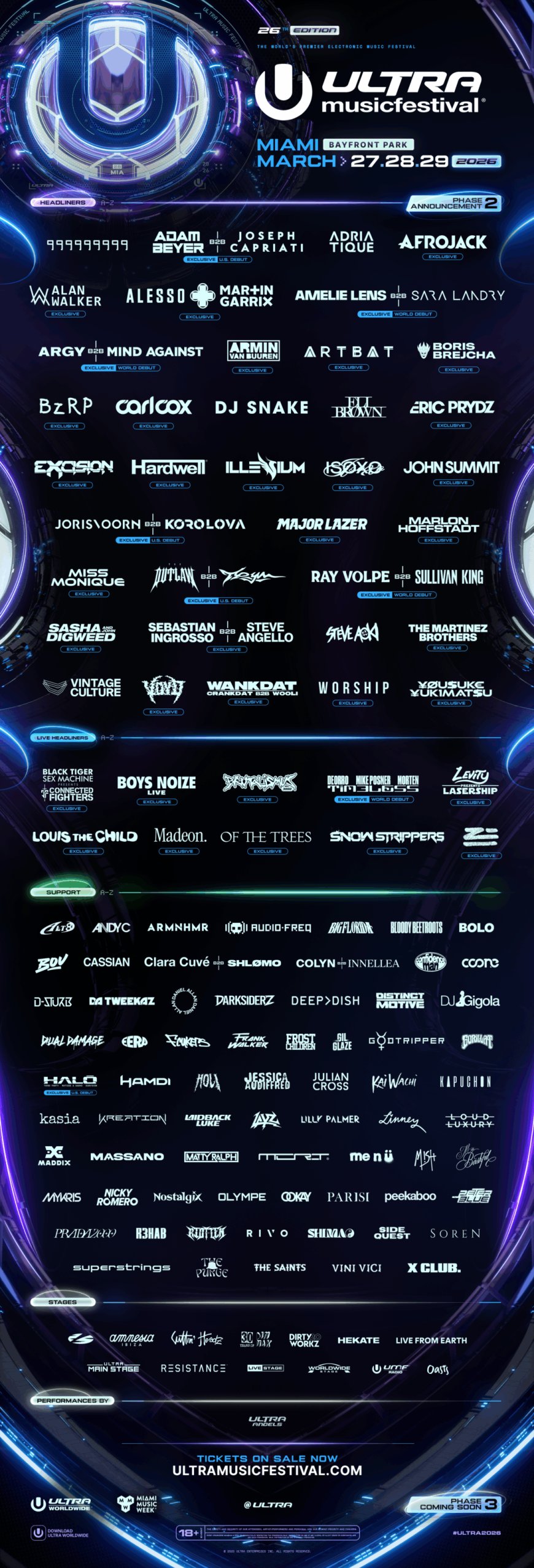 Ultra Music Festival sigue demostrando por qué es uno de los festivales más influyentes en el mundo de la música electrónica. Después de anunciar una primera fase repleta de gigantes como John Summit, Armin van Buuren y el histórico b2b entre Sebastian Ingrosso y Steve Angello, ahora llega una segunda tanda de nombres que ha encendido aún más las expectativas rumbo a su edición 2026 en Bayfront Park, Miami, del 27 al 29 de marzo.